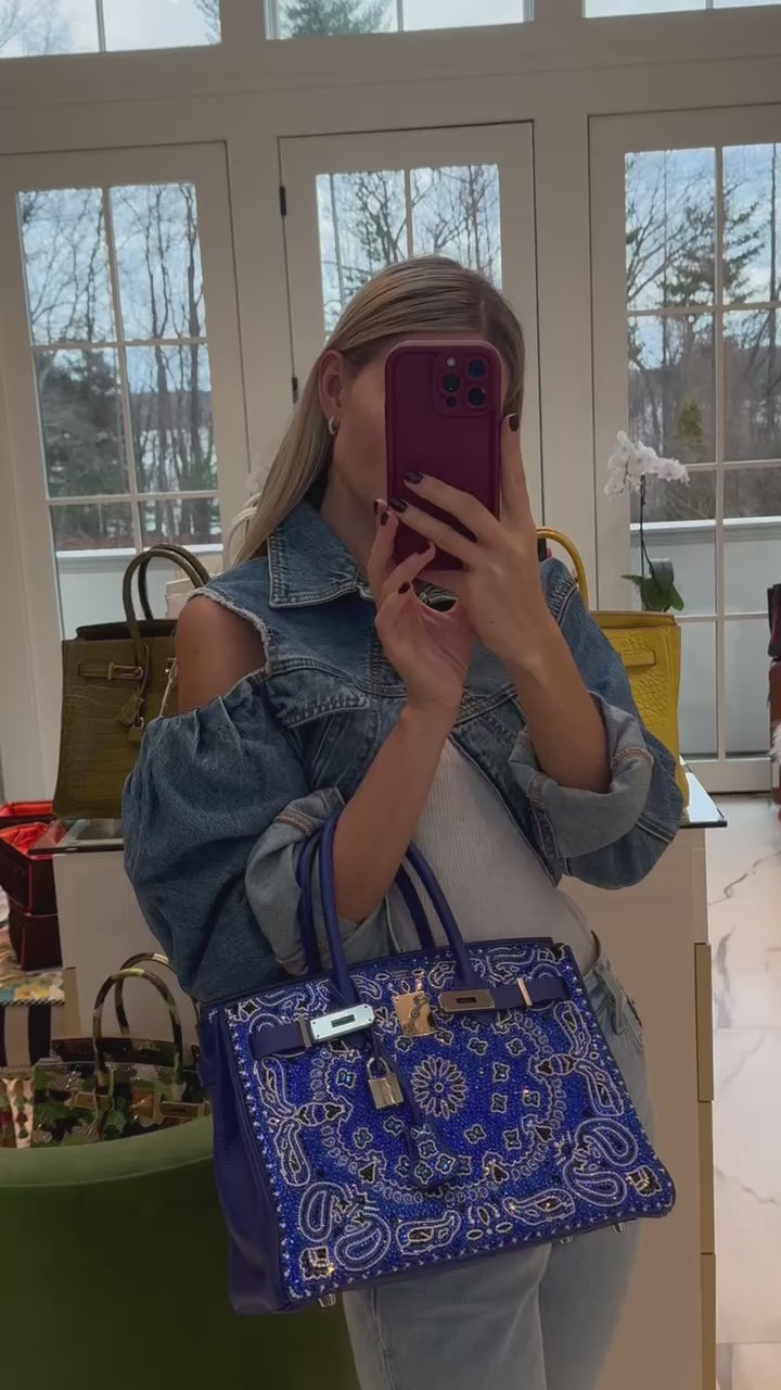 This Hermès Customized Swarovski Crystal Cowgirl Bandana Birkin is a dazzling homage to the wild spirit of the West, reimagined through the lens of a custom crystal encrusted Birkin. Adorned with an intricate array of blue Swarovski rhinestones, this Togo leather Birkin emulates the classic bandana pattern with a luxurious twist. The palladium hardware gleams against the sea of blue, adding a contemporary edge to this sartorial masterpiece. This Hermès Birkin isn't just an accessory; it's a statement that blends the heritage of Americana with the pinnacle of creativity, creating a piece that's as bold as it is beautiful.
