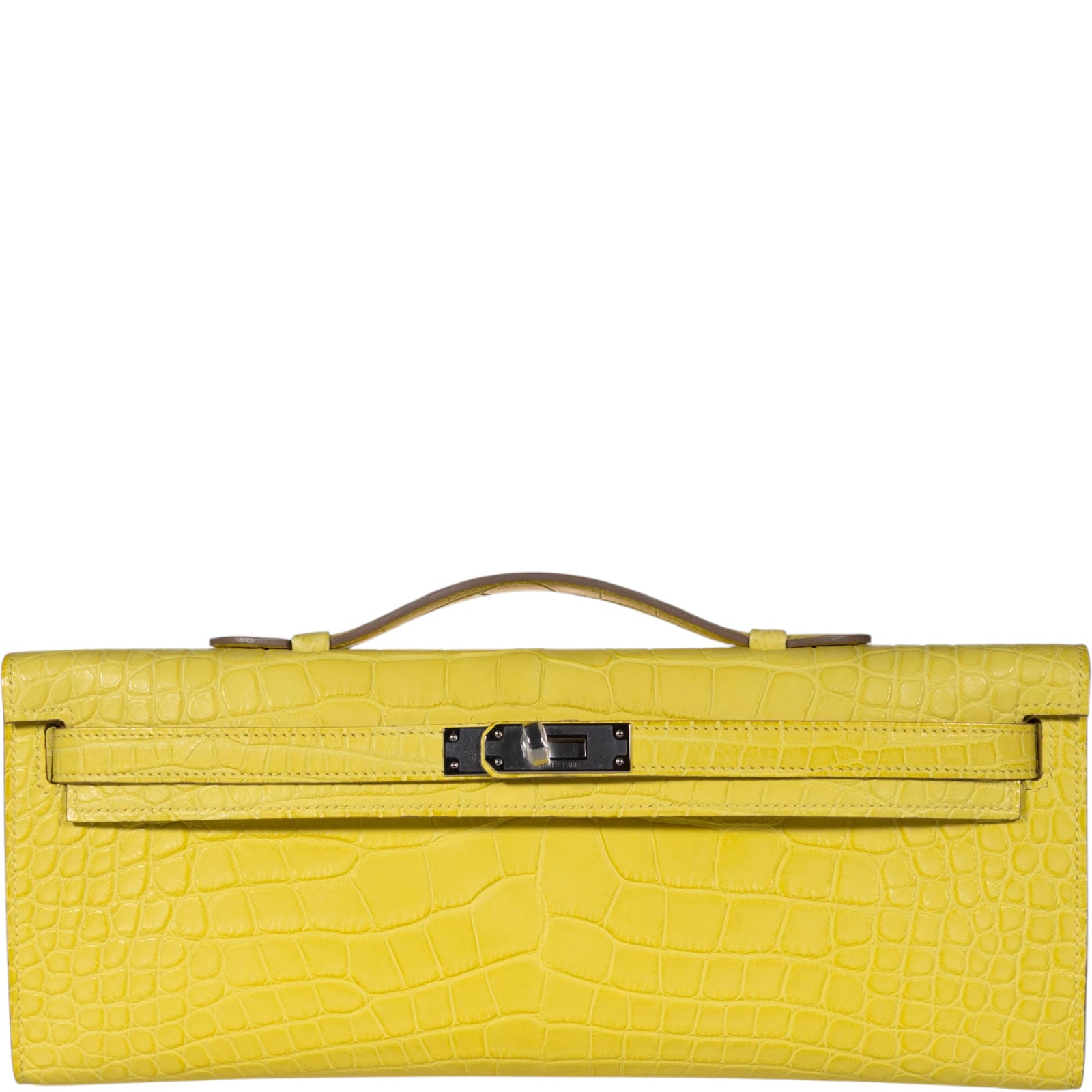 Matte alligator Kelly Cuts from 2005 represent early production of this silhouette in exotic skins. The matte finish requires more careful handling than shiny—oils and moisture show immediately—which makes pristine examples genuinely rare. Lime in matte has particular subtlety; the finish mutes what would otherwise be a bright color into something quieter.