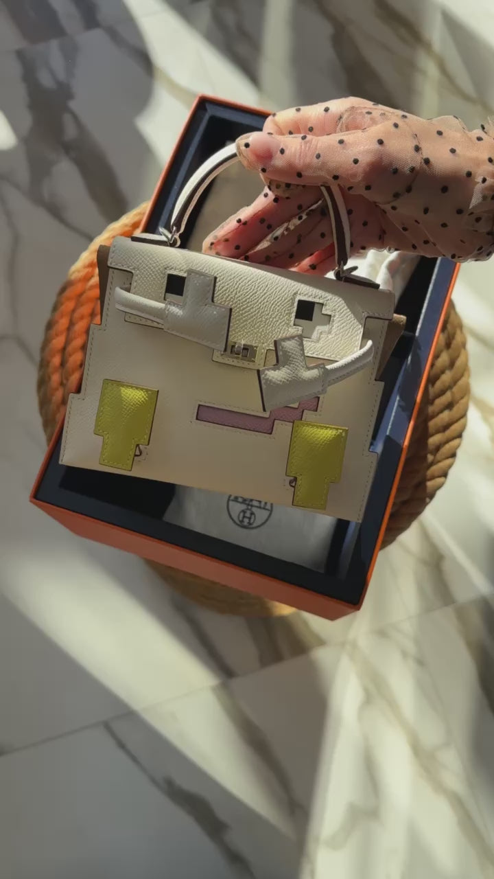 This Hermès Picto Kelly Doll, also known as “Quelle Idole,” is a whimsical creation from 2023 that fuses playfulness with luxury in an unprecedented way. Crafted from resilient Epsom leather, this remarkable bag is rendered in a joyful tricolor palette: Nata provides a serene base, Mauve Sylvestre delivers a touch of whimsy, and Lime adds a zesty pop of color—all harmonized by polished palladium hardware. The doll-like face, complete with endearing features, transforms this piece into a conversation-starting character that radiates cheerfulness. Adding to its charm, a removable Chai Epsom leather backpack boosts functionality and surprises with its versatile design. Finished with the signature blue Hermès box, the Picto Kelly Doll is more than a handbag—it’s a collectible artwork, an emblem of Hermès’ playful spirit and expert craftsmanship.