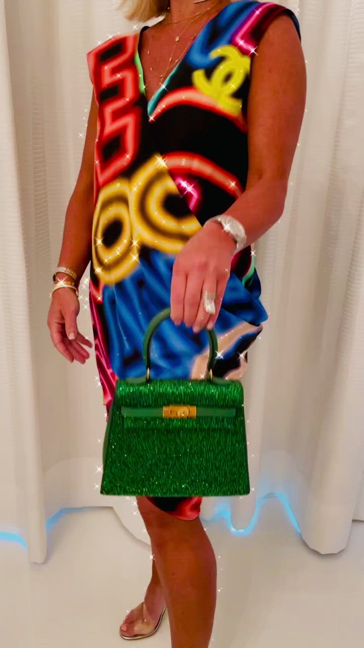 This specific 20cm Kelly bag is crafted from Vert Clair Emerald Epsom leather, known for its vibrant green hue, durability, and grainy texture. The exterior is meticulously adorned with hand-laid Swarovski crystals, adding opulence and sparkle. Complemented by gleaming gold hardware—including the iconic turn-lock closure and padlock—the bag achieves a harmonious and luxurious appearance.