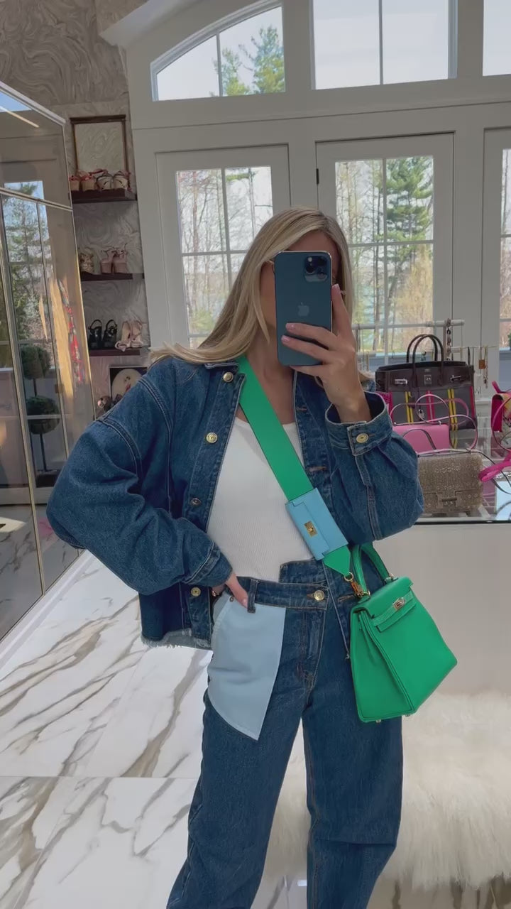 The Bandouliere Kelly Pochette Shoulder Strap Menthe Swift and Celeste Epsom Gold Hardware is an exquisite accessory designed to complement the iconic Hermès Kelly handbag. Meticulously crafted with a combination of two luxurious leathers - Menthe Swift and Celeste Epsom - this shoulder strap is both eye-catching and versatile.
