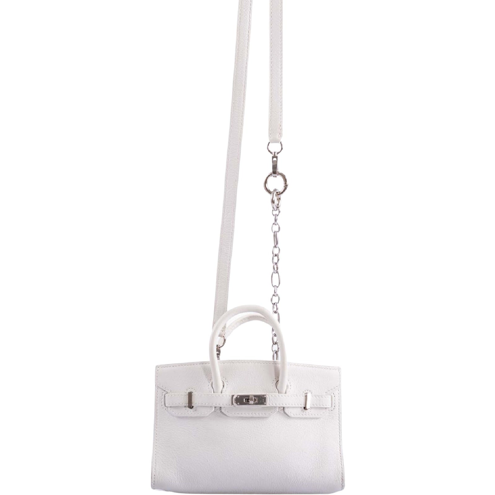 Fifteen centimeters—the smallest Birkin format produced. The Micro Birkin appeared for approximately one to two years around 2011-2012, then was discontinued. At this scale, the Birkin silhouette becomes jewelry-adjacent; capacity is limited to phone, cards, lipstick at most. White Swift with Palladium hardware. White is Hermès's pure white—cooler than Craie or Nata. Swift's smooth finish shows the color cleanly.
