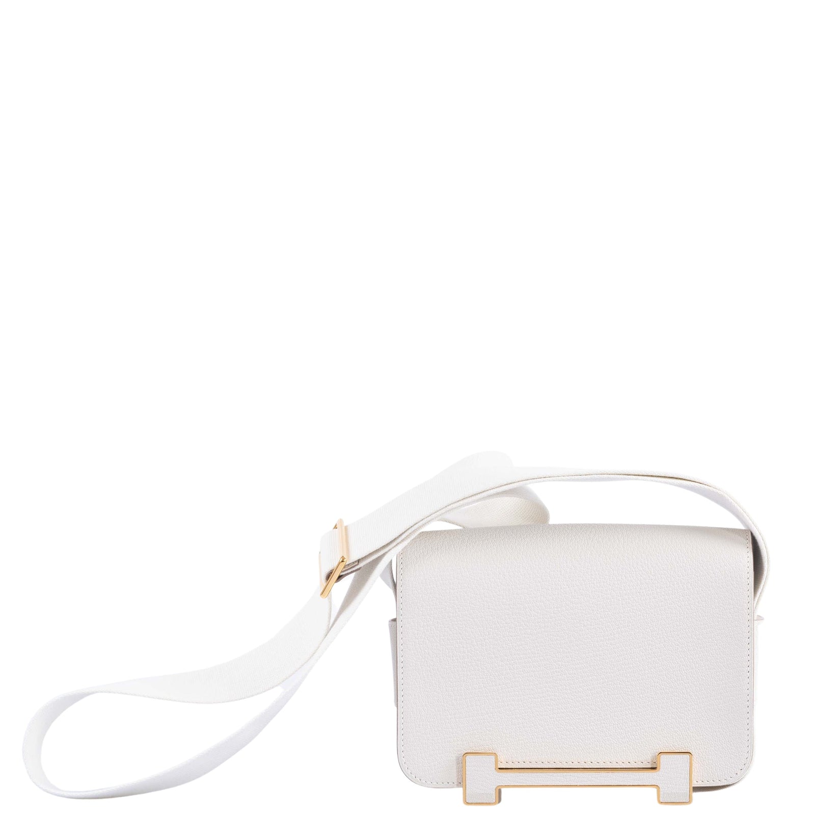 The Geta bag (pronounced "Gueta") by Hermès is a compact, symmetrical messenger bag that is inspired by Japanese wooden platform sandals. Its unique design features a base in the shape of an elongated "H", reminiscent of the classic Hermès Constance closure, giving it a strong, sturdy look. Constructed like a small box, the Geta bag closes with a satisfying click, and is fitted with a canvas adjustable strap for easy carrying. It has been crafted from Mysore Goatskin, giving it a luxurious feel and a polished finish.